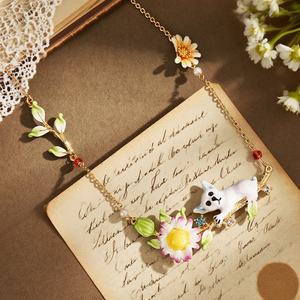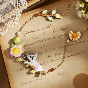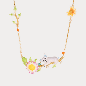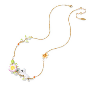 Add a playful touch of nature to your style with this Dog Daisy Necklace. Featuring a sweet pup resting on a golden branch surrounded by blooming daisies and green leaves, the design is full of charm and whimsy. Hand-painted enamel details, pearls, and colourful crystal accents bring it to life, making it a delightful statement piece for dog lovers and anyone who enjoys unique, nature-inspired jewellery.