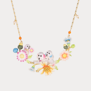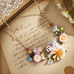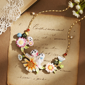 Celebrate joy and playfulness with this Dog Daisy Necklace. Featuring a trio of adorable pups nestled among vibrant daisies and pastel blossoms, the design is full of colour and life. Hand-painted enamel details, golden accents, and delicate pearls create a whimsical yet elegant finish. Perfect for dog lovers and those who enjoy jewellery that tells a cheerful, nature-inspired story.