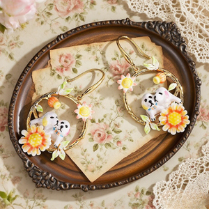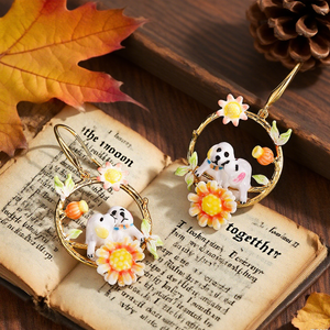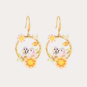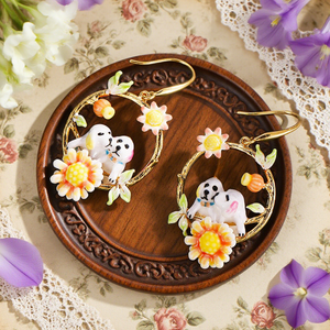 Add a touch of sweetness to your style with these Dog Hoop Earrings. Featuring two adorable pups nestled within golden hoops adorned with cheerful orange and yellow flowers, the design captures both playfulness and elegance. Hand-painted enamel details and vibrant floral accents bring these earrings to life, making them a perfect choice for dog lovers and anyone who enjoys whimsical, nature-inspired jewellery.