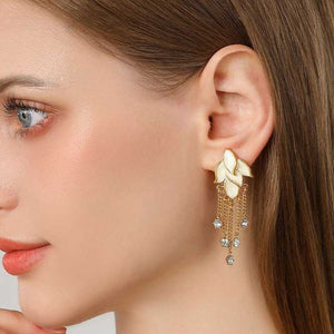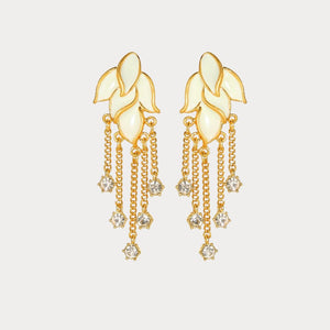 Elevate your elegance with the Golden Leaf Tassel Earrings. Featuring delicate leaf-shaped enamel details, these earrings cascade with shimmering crystal tassels for a touch of sparkle. The gold-tone finish adds a refined touch, making them a perfect statement piece for any occasion.