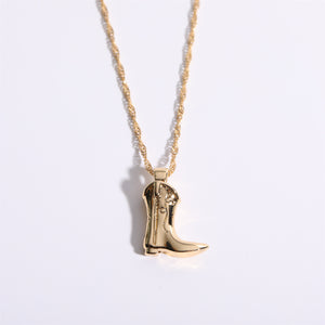 Kick up your style with the Horseshoe Boot Necklace — a golden ode to Western charm. Featuring a beautifully detailed cowboy boot pendant on a textured rope chain, this necklace adds a playful yet polished touch to any outfit. Whether you're headed to the rodeo or just want to channel some cowgirl confidence, this bold piece is perfect for showing off your adventurous spirit. Rugged meets refined in this must-have accessory.