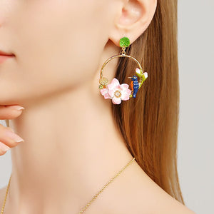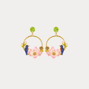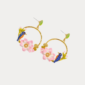 These exquisite earrings showcase a vibrant Kingfisher perched delicately on a branch, surrounded by soft pink lotus blossoms. Handcrafted with meticulous attention to detail, each piece captures the serene elegance of a lotus pond.