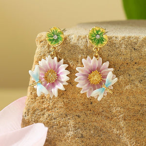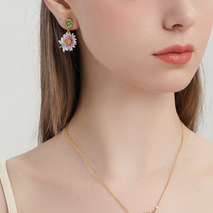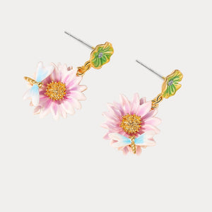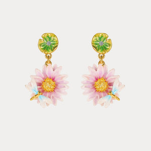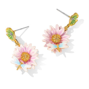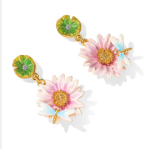 These stunning earrings feature delicate lotus flowers crafted from enamel, with intricate dragonfly accents that add a touch of whimsy. The combination of soft pink petals and shimmering green lily pads creates a harmonious blend of colors, perfect for adding a pop of nature-inspired beauty to any outfit.