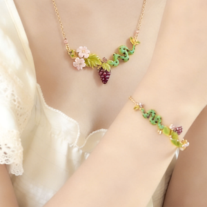 The Snake and Grape Vine Necklace captures a whimsical garden scene, where a playful green serpent winds gracefully through golden grape leaves, delicate blossoms, and a cluster of ripe grapes. Hand-painted enamel details bring vibrant colour and charm to the design, blending nature’s beauty with a touch of mystery. A distinctive piece for those who love nature-inspired jewelry.